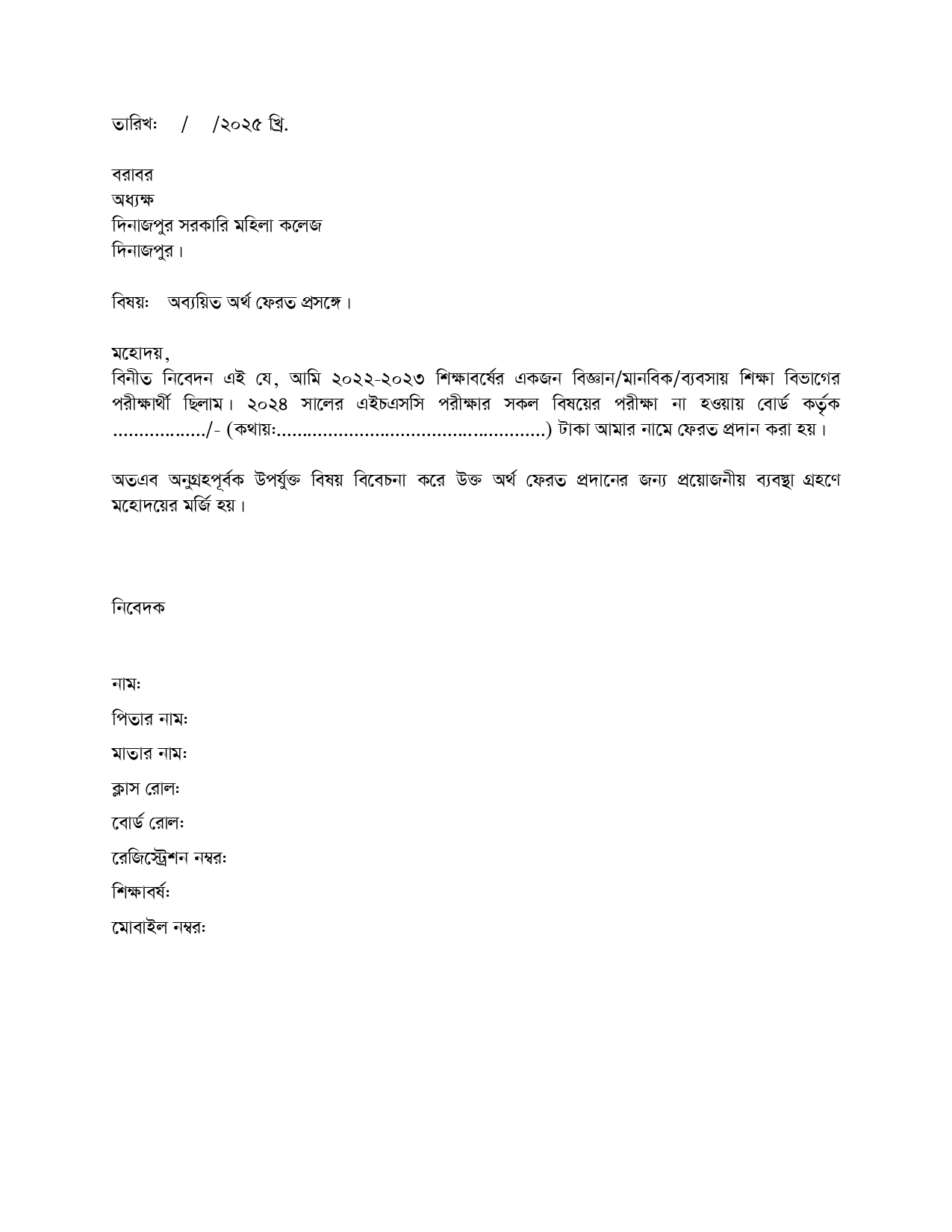 ২০২৪ সালের এইচএসসি পরীক্ষার্থীদের অব্যয়িত অর্থ ফেরত এর আবেদন