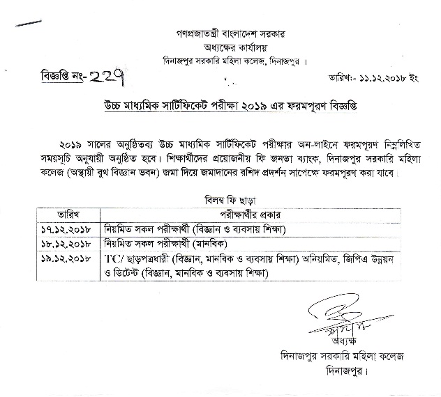 এইচএসসি পরীক্ষা ২০১৯ এর ফরম পূরণের সময়সূচী