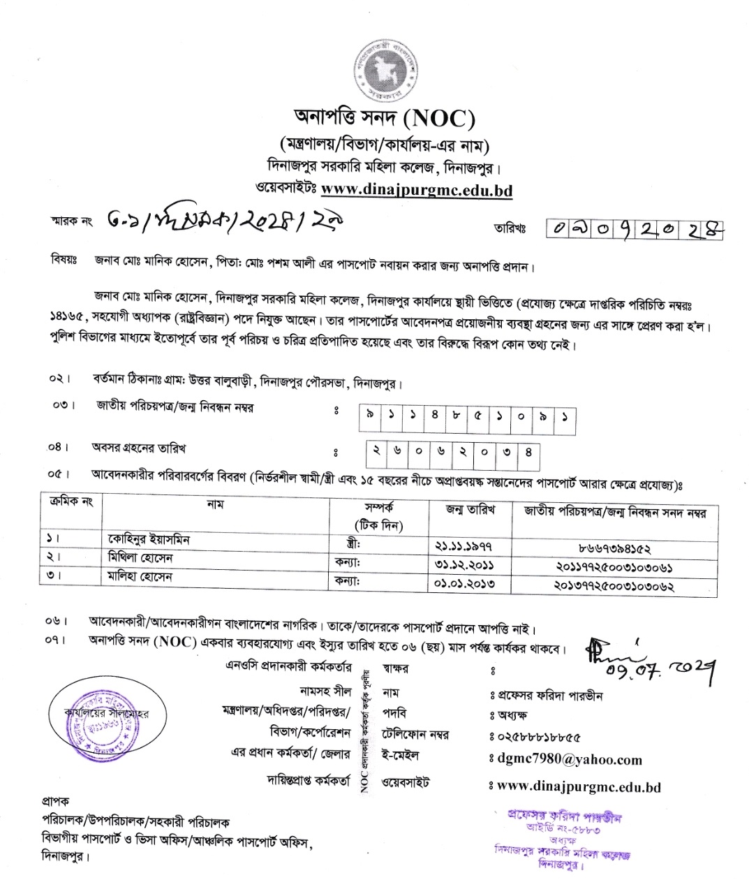 জনাব মো রফিকুল ইসলাম বিভাগীয় অনাপত্তি ফরম (এনওসি)