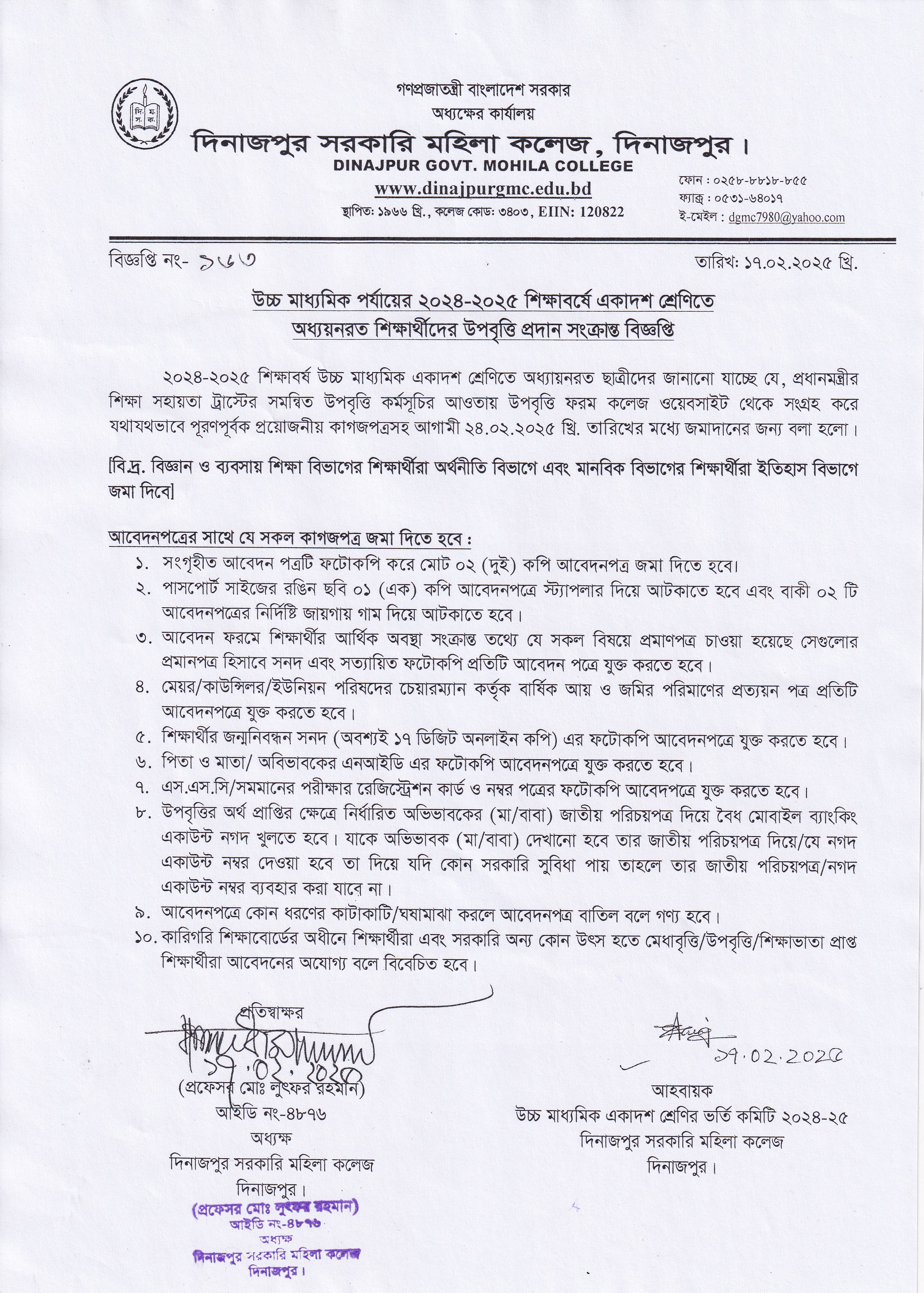 উচ্চ মাধ্যমিক ২০২৪-২৫ শিক্ষাবর্ষের একাদশ শ্রেণির উপবৃত্তির বিজ্ঞপ্তি