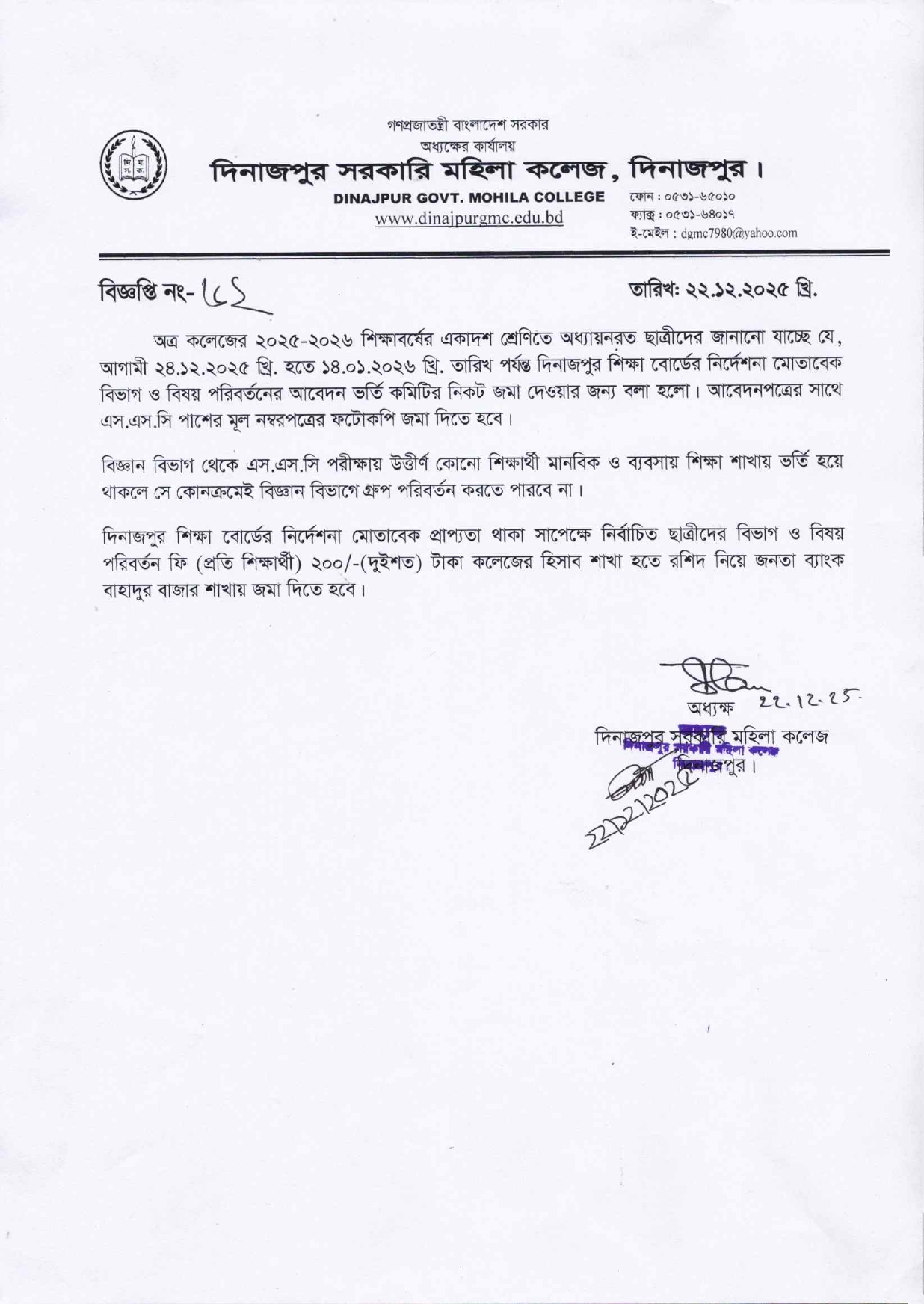 2025-2026 শিক্ষাবর্ষের একাদশ শ্রেণির বিভাগ ও বিষয় পরিবর্তন বিজ্ঞপ্তি