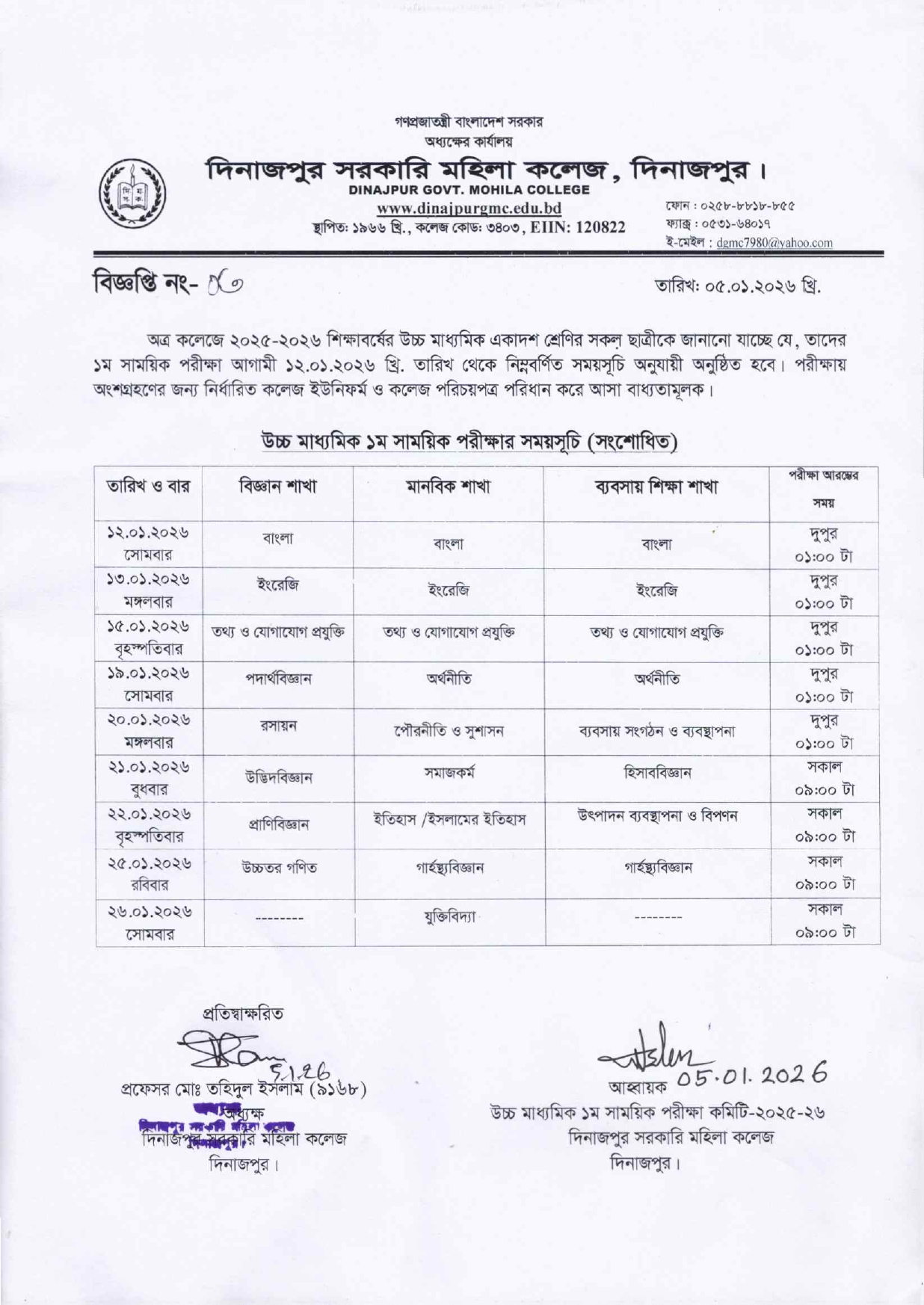 ২০২৫-২৬ শিক্ষাবর্ষের উচ্চ মাধ্যমিক একাদশ শ্রেণির ১ম সাময়িক পরীক্ষার সময়সূচি (সংশোধিত)