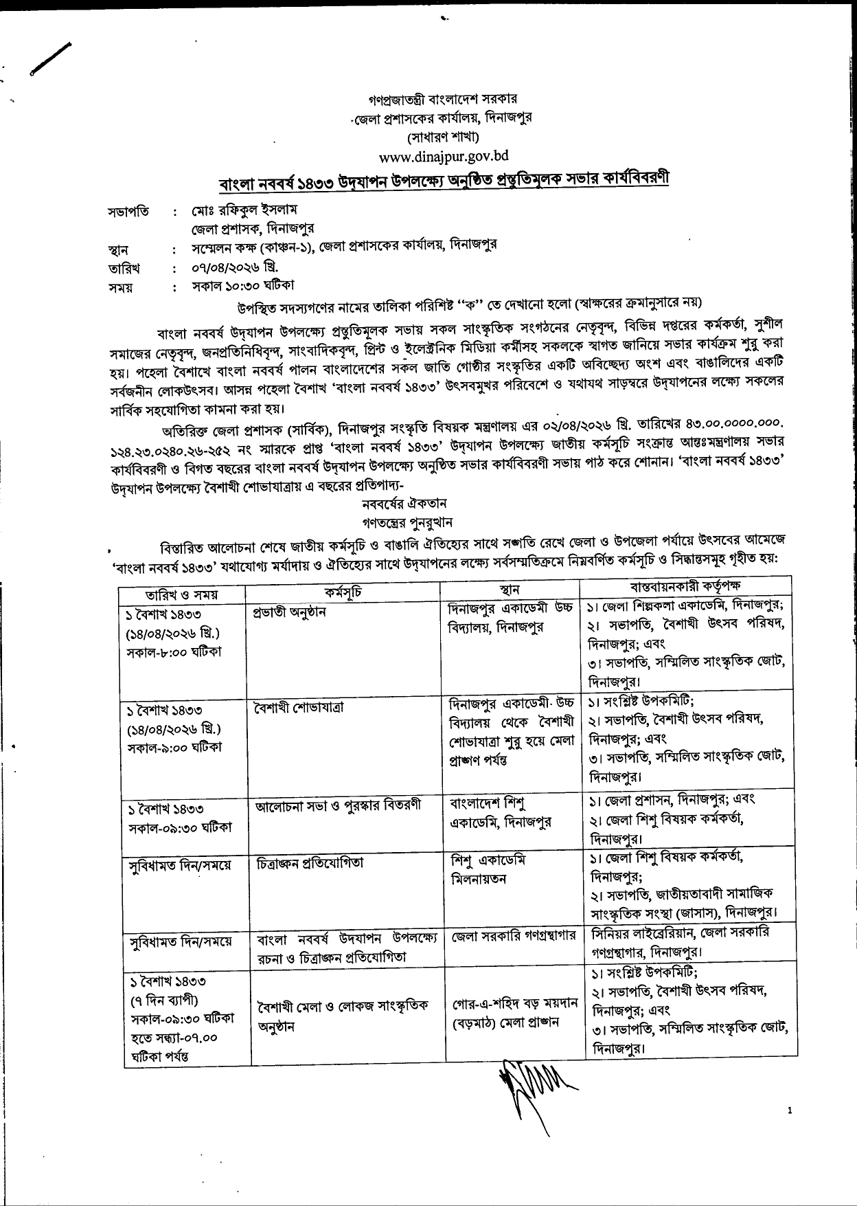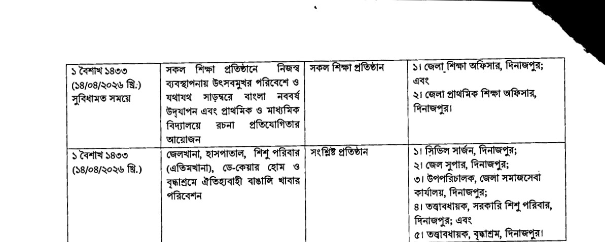 জেলা প্রশাসকের কার্যালয়, দিনাজপুর কর্তৃক আয়োজিত বাংলা নববর্ষ ১৪৩৩ উদ্যাপনের সময়সূচি